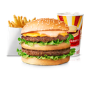 En dubbelburgare med ost, krispig isbergssallad och originaldressing. Allt omslutet av ett rostat sesambröd. Serveras med valfritt tillbehör och dryck.