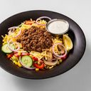 Nötfärs, Ost, Champinjoner, Paprika, Majs, Rödlök, Isbergssallad, Tomater (färska), Gurka, Välj grund och dressing i nästa steg