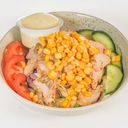 Tonfisk, Ägg, Purjolök, Majs, Ärtor, Morötter, Isbergssallad, Tomater (färska), Gurka, Välj grund och dressing i nästa steg