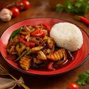 Chilipasta, limeblad, koriander, galangal, citrongräs & grönsaker.