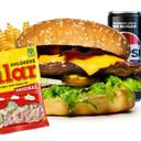 150 g hamburgare med hamburgerdressing, isbergssallad, gul lök, hamburgerost, smörgåsgurka och bacon. Valfri dryck och pommez ingår samt valfri Cloetta godis.