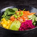 Färska frukter med sallad på risbädd. Välj dressing och protein i nästa steg.