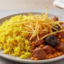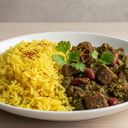Långkok gryta med kalvkött, gula linser och torkade lime. Toppad med strimlade potatis. Ingredienser: kokt ris 50% (ris, saffran, salt och rapsolja) köttgryta 50%(vatten, nötkött, gula linser, lök, rapsolja, tomatpuré och margarin) (palmolja, rapsolja, vatten, syrad skummjölk, salt och emulgeringsmedel) (E471 och E472c), (arom), torkad lime, salt, gurkmeja, kanel, peppar och kryddor (bl.a koriander och kummin)