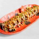 Krispig tempura med avokado och sparris. Toppas med tunatartar, mango-krämsås, Strimlad chili och rostade sesamfrön – en smakrik roll med både fräschör och hetta