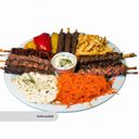 Serveras med ris eller pommes, husets sallad, hummus, grillad tomat, lök och tzatziki.