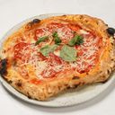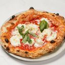 Pizza med tomatsås, buffelmozzarella, parmesan och basilika