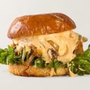 Hamburgare på salladsbädd med tryffeldressing, tomat, ost, picklad rödlök, bacon och ostcréme.