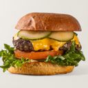 Hamburgare på salladsbädd med chipotledressing, tomat, ost, picklad rödlök och picklad chili.
