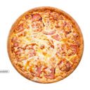 Tomatsås, ost, skinka, räkor och champinjoner.