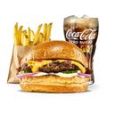 Briochebröd, 114 gram svenskt nötkött, dubbel cheddarost, hellamns majo, silverlök, pickles, ketchup & senap. Medium fries & dricka ingår.