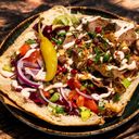 Skivad kalv döner på nygrillat pidebröd. Toppad med varm tomatsås, krämig vitlöksyoghurt och brynt smör. Serveras med syrad rödkål och friterade grönsaker