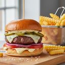 Burgare med 200 g högrevburgare, crown-dressing, saltgurka, tomat, rödlök och pepper jackost. Serveras med pommes frites