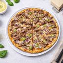 Tomato sauce, cheese, spicy marinated beef, red onions and peppers.