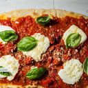 Pizza with minced meat sauce, fresh garlic, onion, taco seasoning mix, jalapeño and taco sauce.