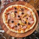 Pizza with ham, prawns, mushrooms, mussels and olives.
