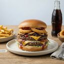 Burger med ost, bacon, majonnäs, parmesan, lök, karameliserad lök, rostad lök och lökringar