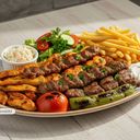 Serveras med blandat köttfärs (250 g), lammfärs (250 g) grillad tomat, paprika, persilja, coleslaw, sallad, tzatziki och pommes eller ris