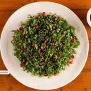 Sallad med romansallad, tomat, gurka, paprika, rädisor, mynta, lök, smak, granatäpple, dressing och gratänger