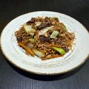 Vetenudlar med sås på jordnötssmör, soya och sesamolja. Toppas med jordnötter, koriander & soya- och tomatbräserad tofu
