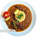 Slow-cooked beef, yellow lentils, cherry tomatoes, dried lime and fried shredded potatoes. Served with saffron rice.