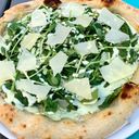 Pizza Bianca with Mozzarella, Garlic fried oyster mushrooms, Champignons, Pecorino Romano, Truffle oil, Basil.