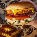 Klassisk burgare med friterad kyckling, tomat, sallad, ost, Bastard originaldressing och rödlök.