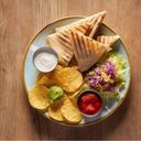 Wheat tortilla, chicken, cheese, arugula. Served with chips, salsa, guacamole, sour cream and salad.