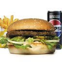 45 g hamburgare med hamburgerdressing och isbergssallad. Liten pommes och en valfri dryck ingår