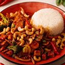 Massaman curry gryta, kokosmjölk, jordnötter, potatis, grönsaker. Serveras med ris