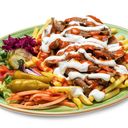 Vår tolkning av den turkiska rätten. Krispigt stekt bröd toppat med saftigt kebabkött, pommes, stark sås och vitlökssås. Serveras med en fräsch salladsmix med tomat, gurka, persilja, rödlök, citron.