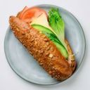 A crisp baguette perfect for breakfast or lunch. It is filled with cheese, ham and vegetables.