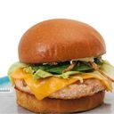 Burger with ketchup, dressing, iceberg lettuce, tomato, cucumber and onion.