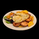 Frasigt stekt bröd med 120 gr nötbiff och 2 vändstekta ägg.