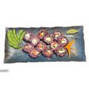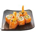 Friterad kyckling med teriyakisås, gurka och crabstick toppad med avokado, teriyakisås och sesamfrön. Serveras med wasabi, soja och inlagd ingefära.