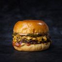 Brioche bröd, 100 g högrevsfärs, cheddarost, hot mexicana, tomat, sallad och stekt lök.