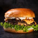 Brioche bröd, 100 g högrevsfärs, cheddarost, tryffelmayo, picklad gurka, sallad och stekt lök.