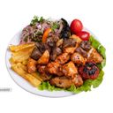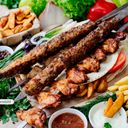 Shish kebab, kycklingspett och kycklingvingar med tandoori naan.