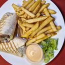 Grillad kebab rulle med nött kött lök tomat sallad gurka och valfrisås ink pommes