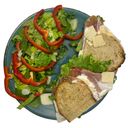 Serveras med tunt skivad skinka, skarp cheddarost, krispig sallad, tomat, majonnäs och surdegsbröd.