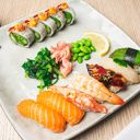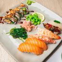 4 lax, 2 halstrad lax, 2 räkor, 2 tonfisk, 2 avocado, 2 tofu, 2 gunkan, 2 krabba, 2 ägg, 10 rullar