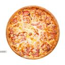 Pizza med tomat, ost, skinka, champinjoner, räkor, lök och paprika.