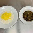 En gryta med linser, långkokkött, tomat och potatis, serveras med saffranris.