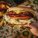 Vår variant av gatuköksburgaren med Bastard originaldressing, tomat, sallad, veganost och rödlök. MBOOM Burger är en svensk växtbaserad burgare gjord av Peas of Heaven & Marcus Samuelsson.