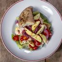 Sallad med kyckling, tomater, lök, krotonger och caesardressing