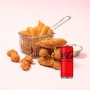 8 popcorn chicken, 2 crispy chicken tenders, pommes, valfri sås och valfri dryck.