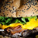 Burgare med BBQ-sås, cheddarost, bacon, karamelliserad lök, krispsallad, rostad lök, senap och ketchup.