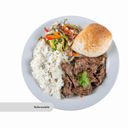 Ett spett med kycklinginnerfilé och marinerad Oxfilé. Serveras med persiskt ris och tillbehör.