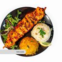 Saffrans och limemarinerad Kycklingfilé på spett. Serveras med grillad tomat, yoghurtsås och ris.