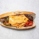 Serveras med strimlad entrecoté, paprika, lök, cheddarsås, mozarella
