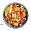 Wokade risnudlar eller äggnudlar med kyckling, ägg, grönsaker och kordnötter.